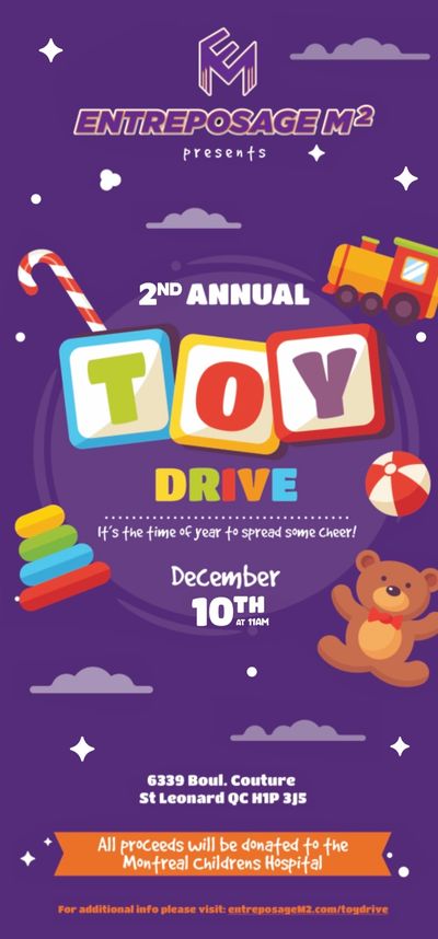 At 11am on December 10th at 6339 Boul Couture, Saint-Leonard for our 2nd Annual Toy Drive. It's always fun to give but this time it's a party. Join in on the fun with a live dj, food and drinks will be available for purchase with all the proceeds going to the Montreal Children's Foundation. All you need to do is: book the date, buy a toy and enjoy the Holiday Spirit by giving.